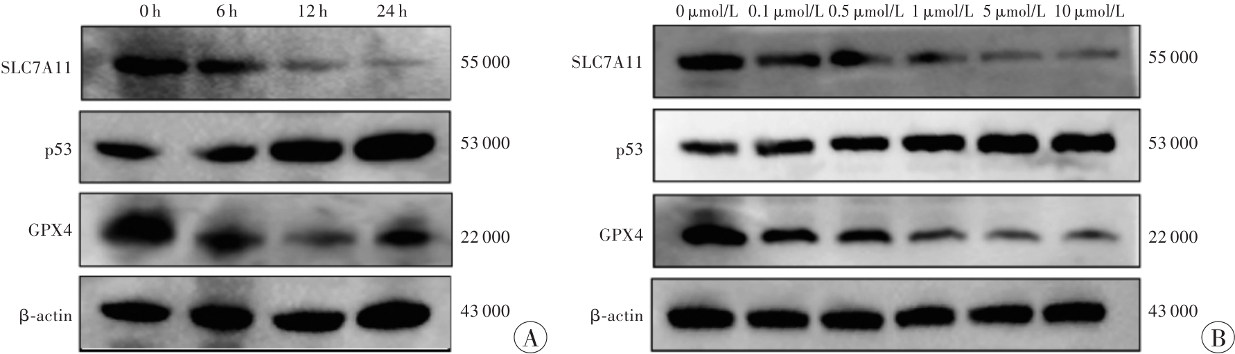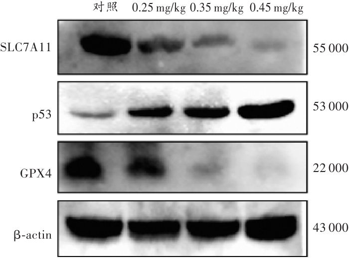 目的 通过检测α-鹅膏毒肽暴露后小鼠肝组织铁沉积,小鼠肝细胞和L-02细胞氧化应激指标及铁死亡相关蛋白的表达,探究铁死亡是否参与α-鹅膏毒肽诱导的肝细胞损伤。 方法 建立α-鹅膏毒肽C57BL/6J小鼠中毒模型和L-02细胞染毒模型,采用Lillie二价铁染色、普鲁士蓝染色检测铁沉积情况,试剂盒检测超氧化物歧化酶(superoxide dismutase,SOD)、过氧化氢酶(catalase,CAT)、丙二醛(malondialdehyde,MDA)、谷胱甘肽(glutathione,GSH)水平,蛋白质印迹法分析p53、溶质载体家族7成员11(solute carrier family 7 member 11,SLC7A11)、谷胱甘肽过氧化物酶4(glutathione peroxidase 4,GPX4)的表达。 结果 相较于对照组,α-鹅膏毒肽暴露后,小鼠肝组织中二价铁(Fe²⁺)和三价铁(Fe³⁺)阳性细胞率均升高(P<0.05),中(0.35 mg/kg)、高(0.45 mg/kg)剂量组肝组织及1 μmol/L α-鹅膏毒肽处理的L-02细胞中GSH水平降低、MDA水平升高,SOD和CAT活性下降(P<0.05)。此外,α-鹅膏毒肽呈浓度和时间依赖性上调p53表达,并抑制SLC7A11和GPX4的表达。 结论 铁死亡在α-鹅膏毒肽诱导的肝细胞损伤机制中发挥作用,铁死亡相关指标的异常可为α-鹅膏毒肽中毒的法医学鉴定提供参考。