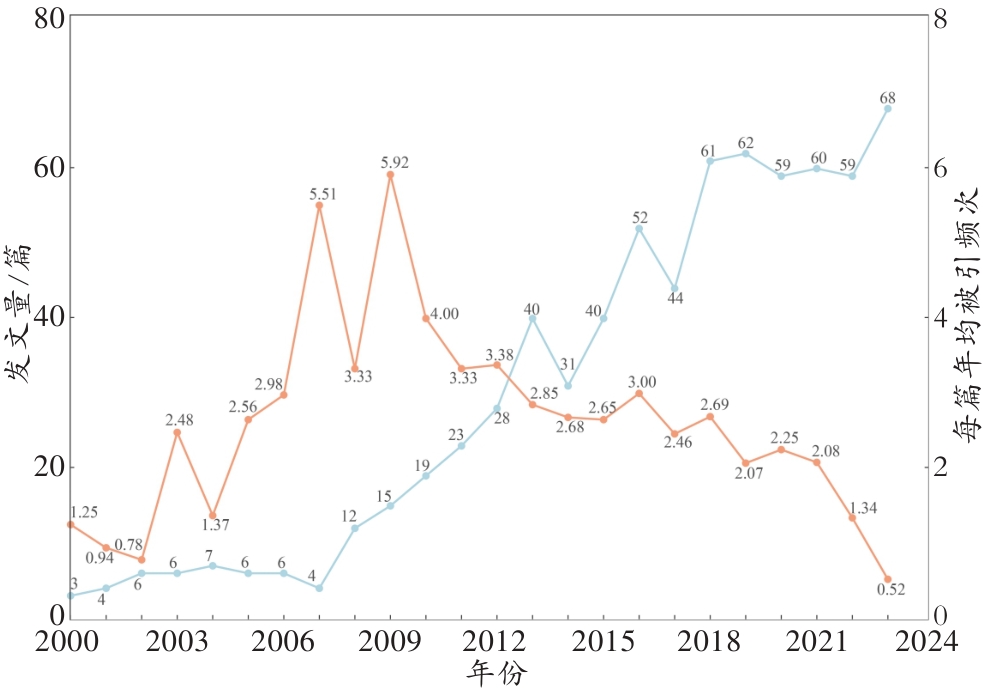 图1 2000—2023年法医学体液鉴定领域发文量及年均被引趋势蓝色曲线表示发文量;红色曲线表示被引频次。