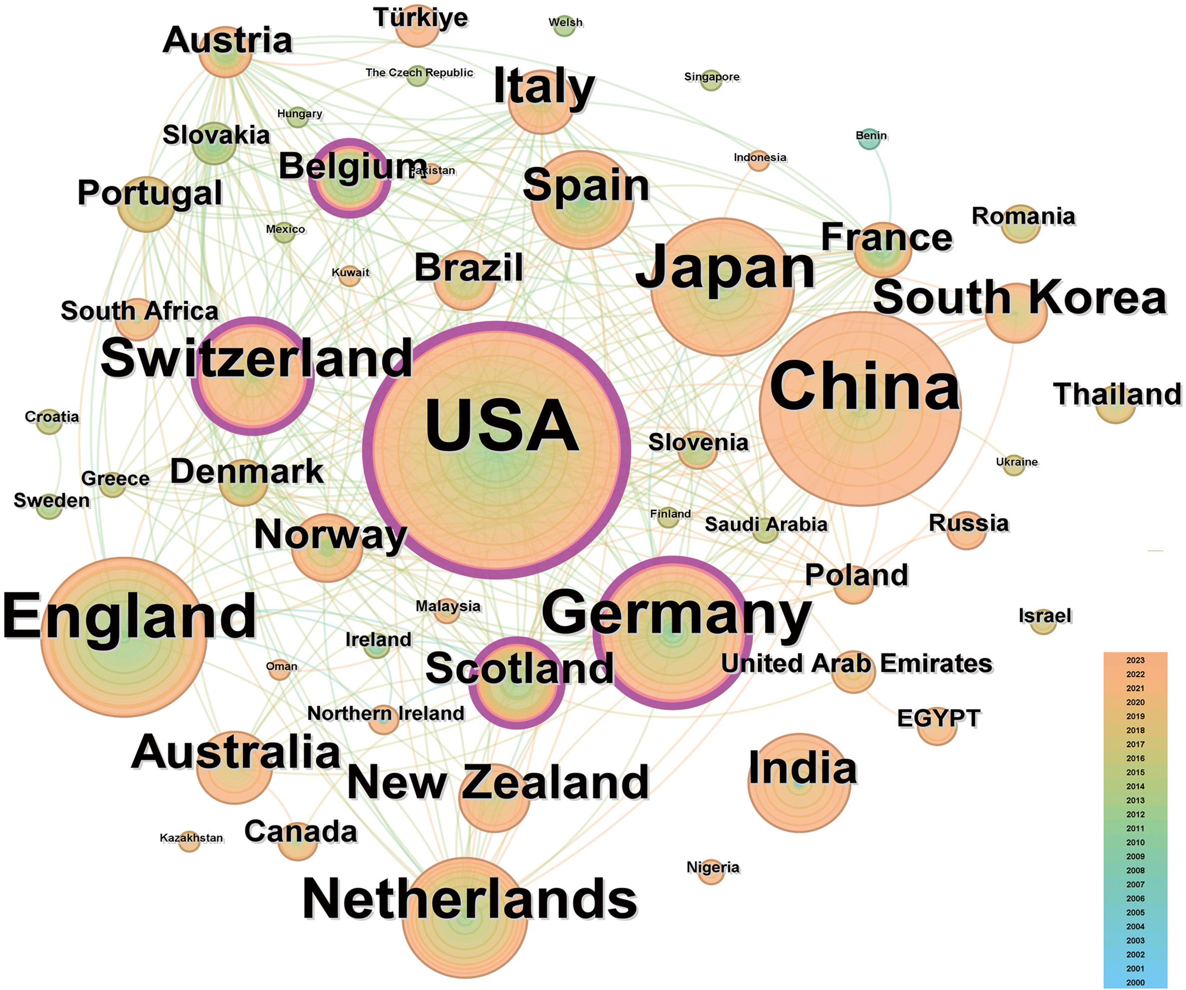 图2 法医学体液鉴定领域国家(地区)合作共现网络图谱节点大小代表国家(地区)的发文量,节点越大即发文量越高;外圈标记为粉紫色的节点表示其中介中心性>0.1,节点内圈的颜色代表发文年份;节点之间连线的粗细代表合作关系的强弱,颜色对应节点代表首次共现的时间。
