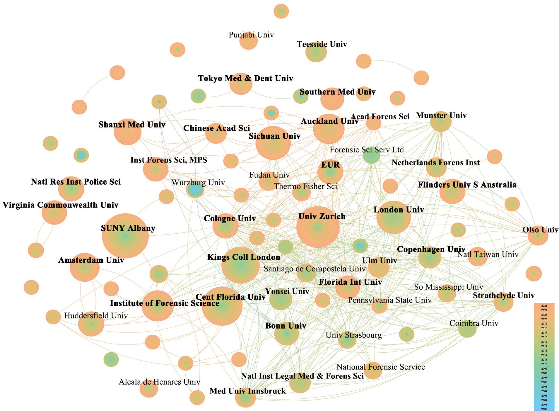 图3 法医学体液鉴定领域机构合作共现网络图谱节点大小代表机构的发文量,节点越大即发文量越高;节点内圆圈的颜色代表发文年份;节点之间连线的粗细代表合作关系的强弱,颜色对应节点代表首次共现的时间。