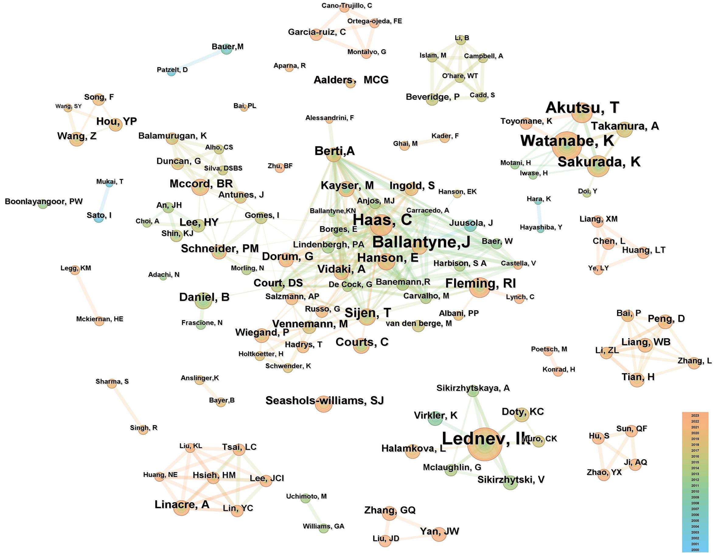 Fig. 4 Co-occurrence network map for author cooperation in the field of forensic body fluid identification