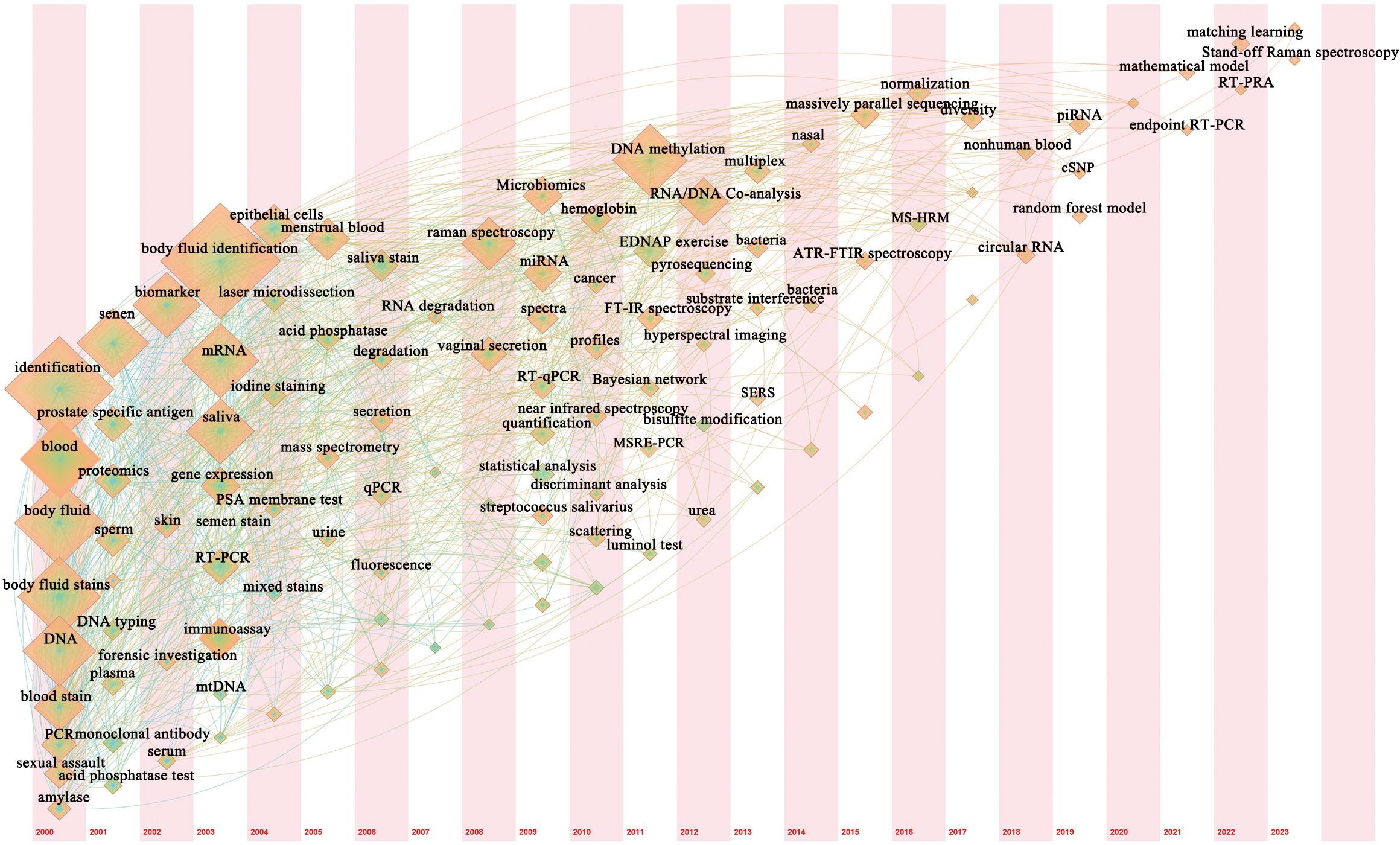 Fig. 7 Burst keywords in the field of forensic bodyfluid identification from 2000 to 2023