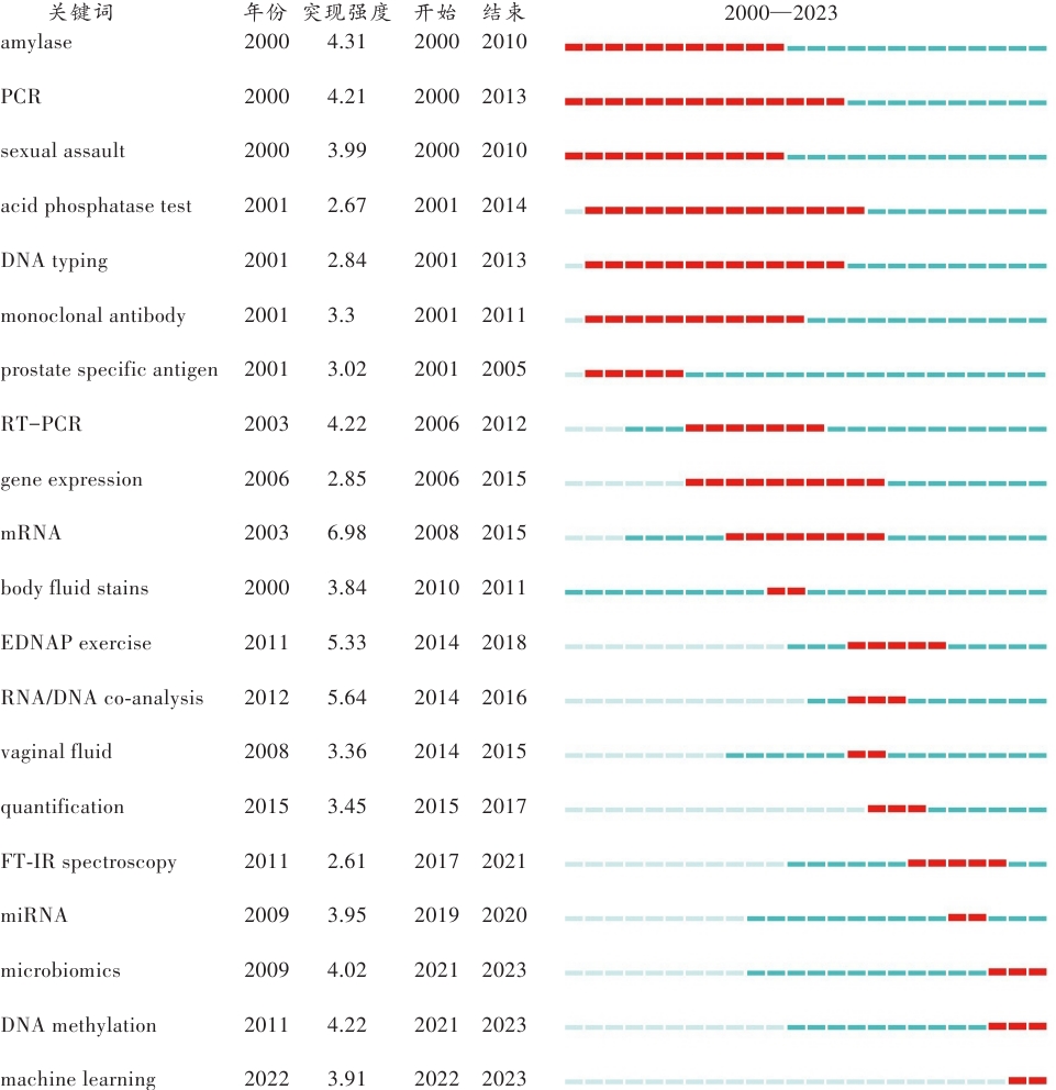 图7 2000—2023年法医学体液鉴定领域的突现关键词每个单元格代表1年的时间跨度,深蓝色表示在该年度内此关键词出现,而红色则表示发文数量激增持续的时期。