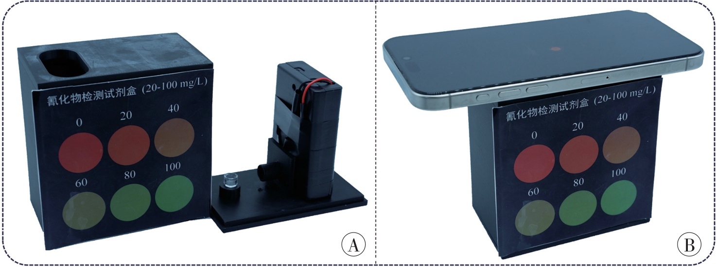 Objective To establish a rapid analysis method for cyanide based on a ratiometric fluorescent probe, providing a quantitative strategy for on-site visual and rapid detection of cyanide. Methods A dual-emission ratiometric fluorescent probe (AuNCs-FL) was constructed by using bovine serum albumin (BSA)-stabilized gold nanoclusters (AuNCs, fluorescence emission at 660 nm) as the responsive signal unit and fluorescein (FL, emission at 515 nm) as the internal reference. Results The etching effect of cyanide on AuNCs resulted in fluorescence quenching at 660 nm, while the fluorescence intensity of FL at 515 nm remained unchanged, enabling a rapid response analysis of cyanide shift from red to green fluorescence. The developed probe enabled rapid analysis of cyanide within 3 min, with a limit of detection (LOD) of 3.4 mg/L and a visual detection range of 10-100 mg/L. Conclusion The AuNCs-FL fluorescent probe is structurally simple, low-cost, and easy to operate, delivering rapid and accurate results. It also avoids the interference from sulfides encountered in commercial cyanide test kits, making it suitable for the on-site rapid detection of suspected powder samples in cyanide poisoning cases.