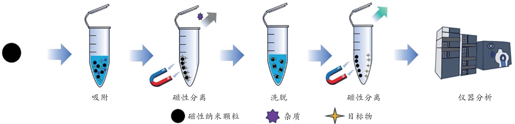 | 磁性纳米材料 | 吸附能力强,具有磁性,表面易功能化修饰 | 作为MSPE的吸附剂核心,常用于污水[ | 操作简便、快速,可利用外磁场实现快速分离,减少有机溶剂用量,易于与自动化设备和便携式检测平台集成[ | 存在选择性不足的问题,通常与分子印迹聚合物[ |
