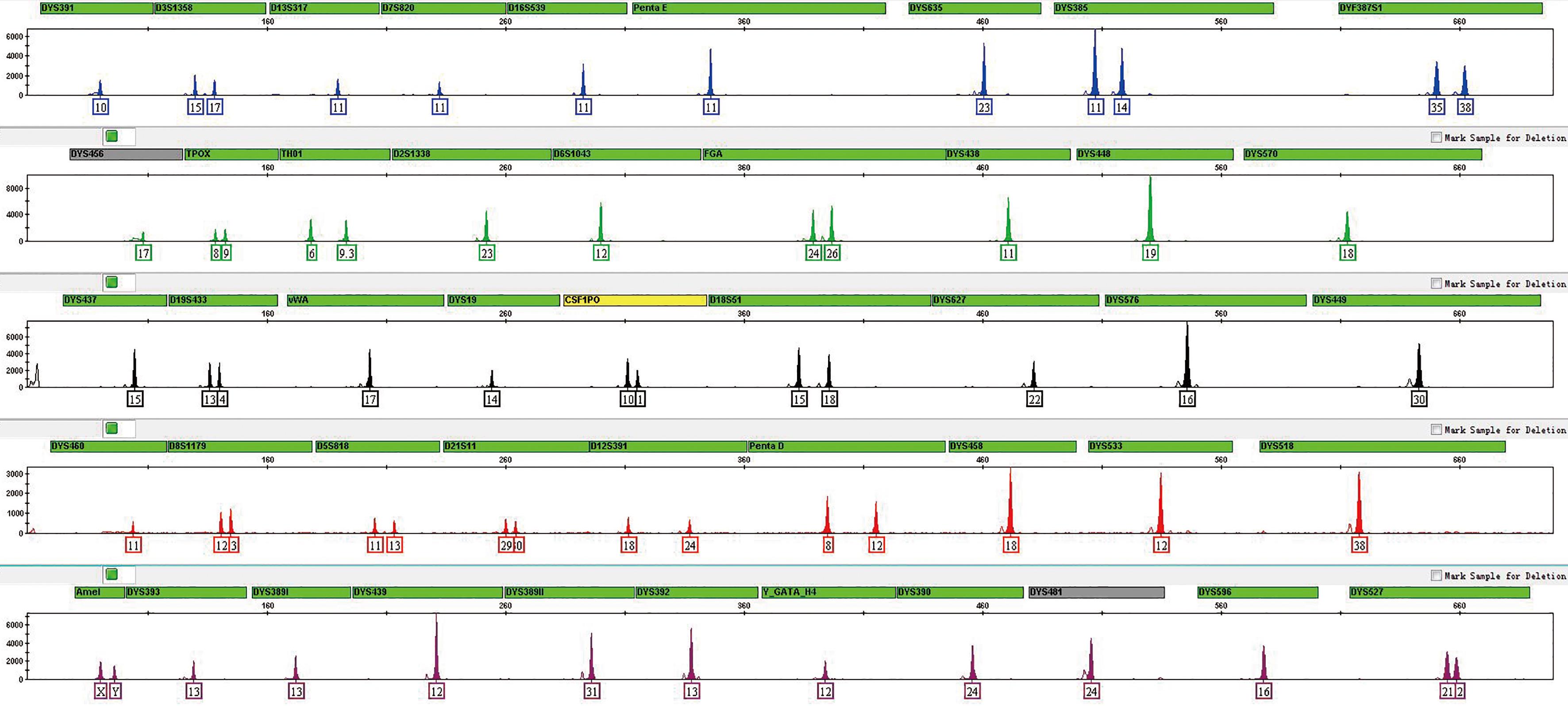 | Fig. 3 Electrophoretogram of standard sample 9948 tested by 3500xL Gene Analyzer and EX20+30Y Kit |