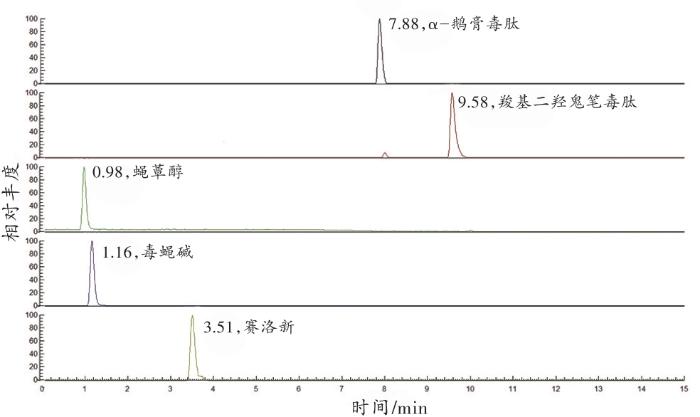 HELFER A G, MEYER M R, MICHELY J A,et al. Direct analysis of the mushroom poisons alpha- and beta-amanitin in human urine using a novel on-line turbulent flow chromatography mode coupled to liquid chromatography-high resolution-mass spectrometry/mass spectrometry[J]. J Chromatogr A,2014,1325:92-98. doi:10.1016/j.chroma.2013.11.054.