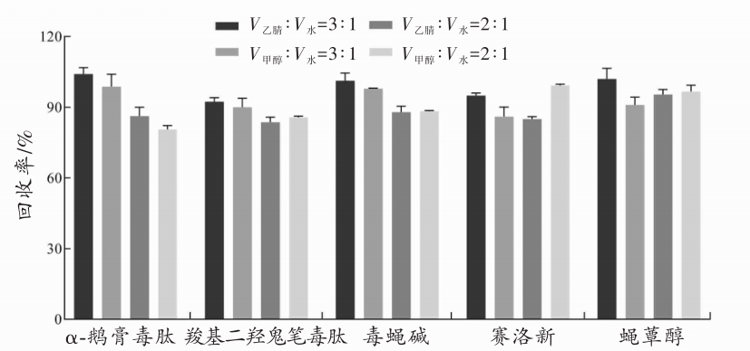 | 图1 不同提取溶剂对5种蘑菇毒素回收率的影响 |