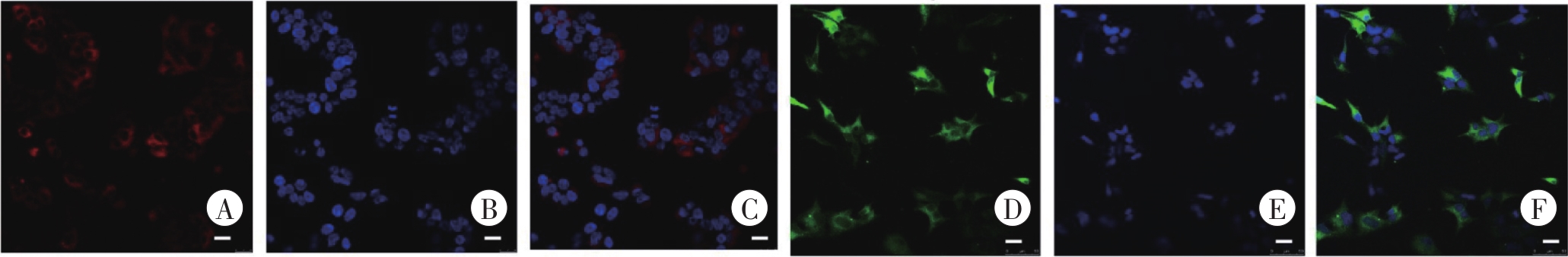 | 图8 慢病毒转染HEK293细胞的激光共聚焦成像 A、B、C为LV-CMV-mCherry-CCK1R-Flag-WPRE-pA;D、E、F为LV-CMV-EGFP-CCK2R-HA-WPRE-pA。A、D为CCK1R和CCK2R的荧光标记;B、E为DAPI;C、F为Merge。Bar=20 μm。 |