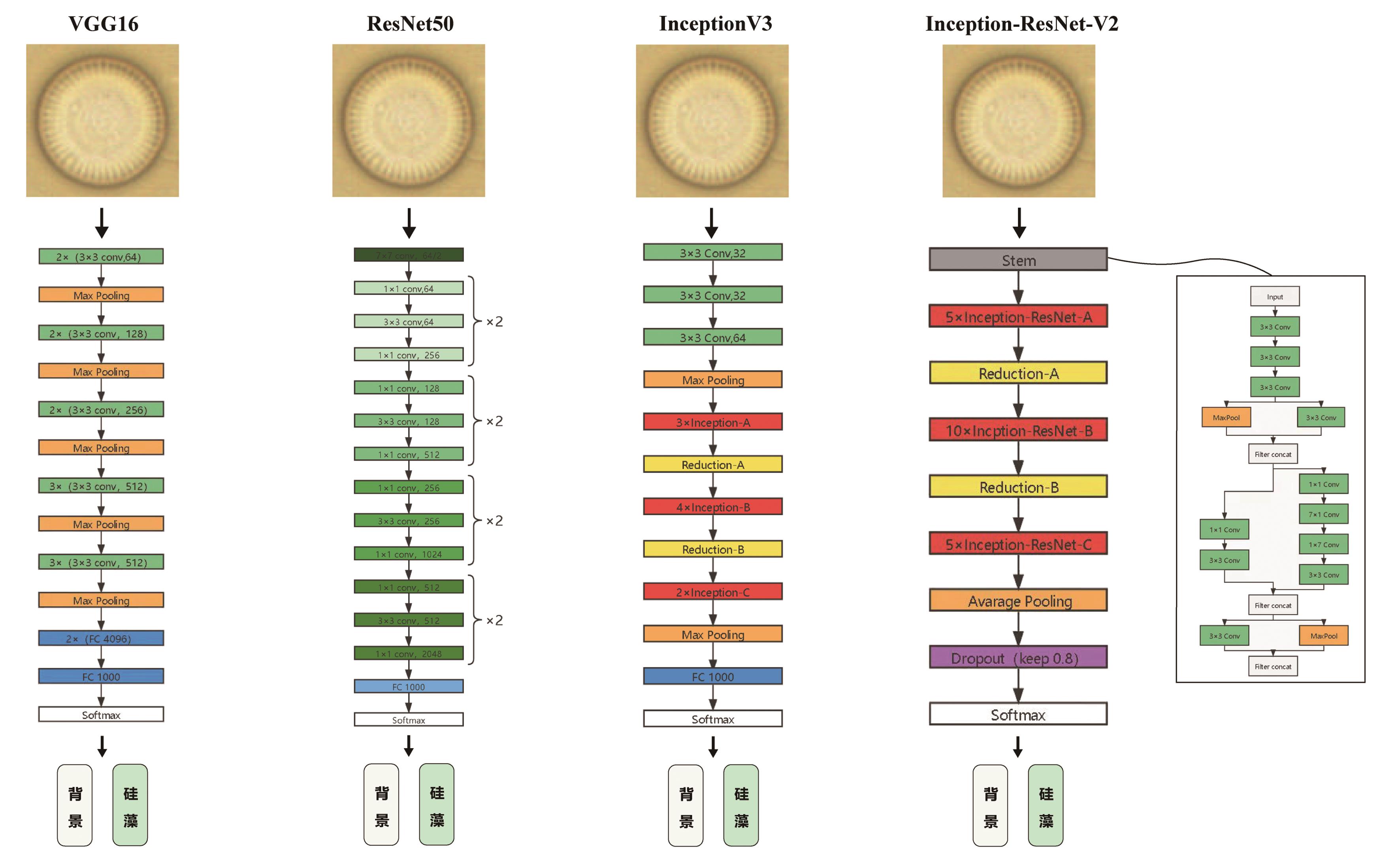 | 图2 4种DL图像分类模型模式图 绿色表示卷积层;橙色表示池化层;蓝色表示全连接层;白色表示Softmax分类器;红色表示Inception模块。 |