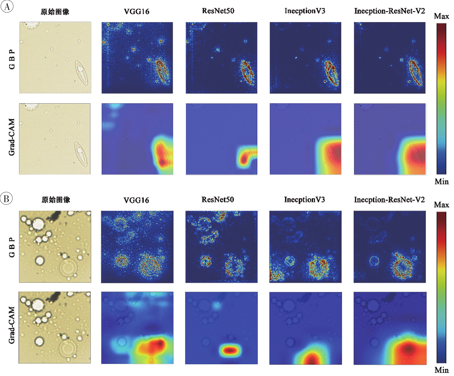 | 图6 应用Grad-CAM和GBP方法对4种模型在中心纲及羽纹纲硅藻识别上的热图分析 A:中心纲分析结果;B:羽纹纲分析结果。红色像素代表模型高度关注的区域。 |