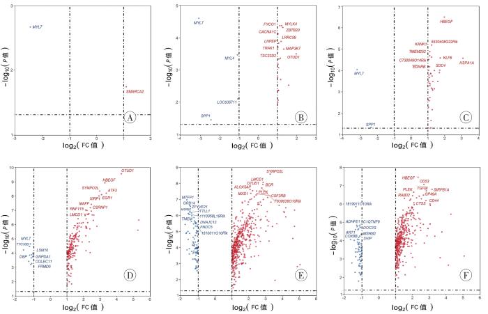 基于芯片平台(GPL81、GPL82、GPL83)的基因注释信息使用perl语言进行转录本注释,将探针ID转化为基因符号或者Entrez编号(Entrez ID)。对于同一基因的多个探针,取差异表达最明显的数值进一步分析。删除测序结果中的非mRNA探针,并对处理后的结果进行归一化处理。在R.4.0.4环境下,使用R软件包impute(R/Bioconductor package impute v3.15)对芯片原始数据进行背景校正和分位数标准化后,用R软件包limma(R/Bioconductor package limma v3.32.2)进行差异表达分析,将阈值设定为差异变化倍数(fold change,FC)上调或下调2倍(|log2 FC|>1)且P <0.05。使用R软件包ggplot2(R/Bioconductor package ggplot2 v3.3.5)绘制6个时间点差异表达基因的火山图。