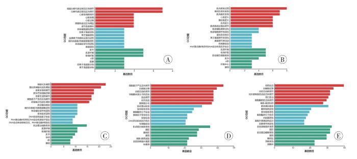 A:1 h;B:4 h;C:12 h;D:24 h;E:48 h。红色为生物功能,蓝色为分子功能,绿色为细胞组分。