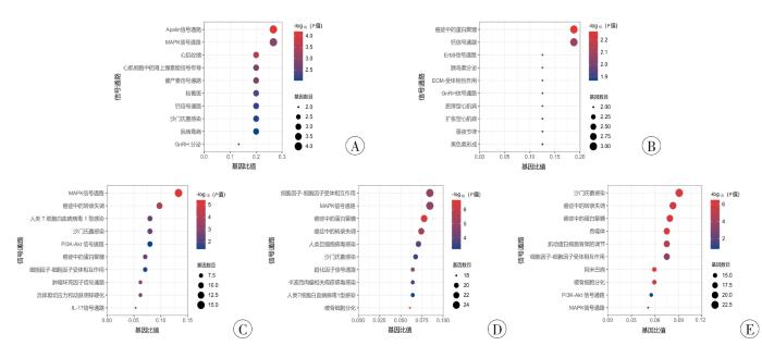 KEGG信号通路分析结果显示,AMI后0.25 h仅2个差异基因未得到富集结果。从图3 可以看到,差异表达基因在AMI 1 h后主要参与了Apelin信号通路、丝裂原活化蛋白激酶(mitogen-activated protein kinase,MAPK)信号通路、心肌收缩、心肌细胞中的肾上腺素能信号传导等;AMI后4 h主要富集于癌症中的蛋白聚糖、钙信号通路、ErbB信号通路等;AMI后12 h主要富集于MAPK信号通路、PI3K-Akt信号通路、流体剪切应力与动脉粥样硬化等;AMI后24 h主要参与细胞因子-细胞因子受体相互作用、MAPK信号通路、趋化因子信号通路等;AMI后48 h主要参与沙门氏菌感染、吞噬体、肌动蛋白细胞骨架的调节等(图3 E)。