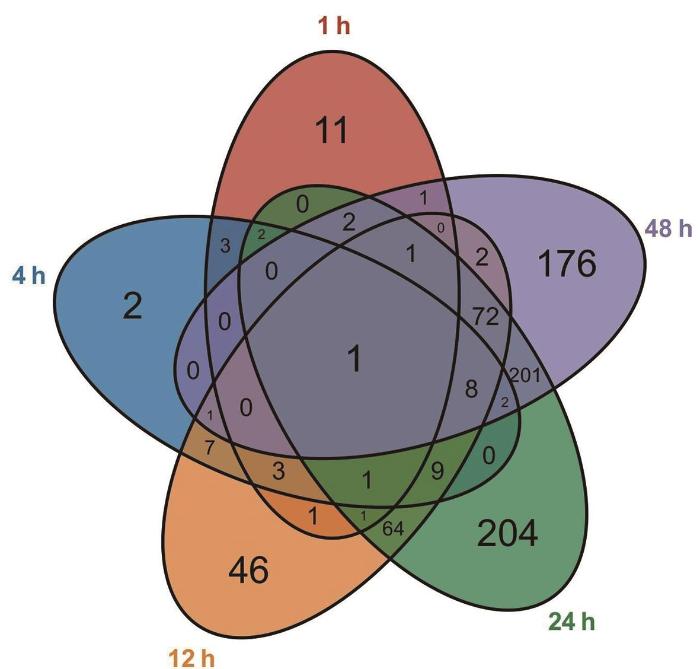 红色:1 h;蓝色:4 h;橙色:12 h;绿色:24 h;紫色:48 h。数字分别代表各时间点差异表达基因数量。