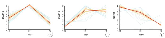 A:先上调后下调基因;B:上调基因;C:下调基因。红色为该聚类中心变化,黄-灰-蓝颜色变化表示依次偏离聚类中心。