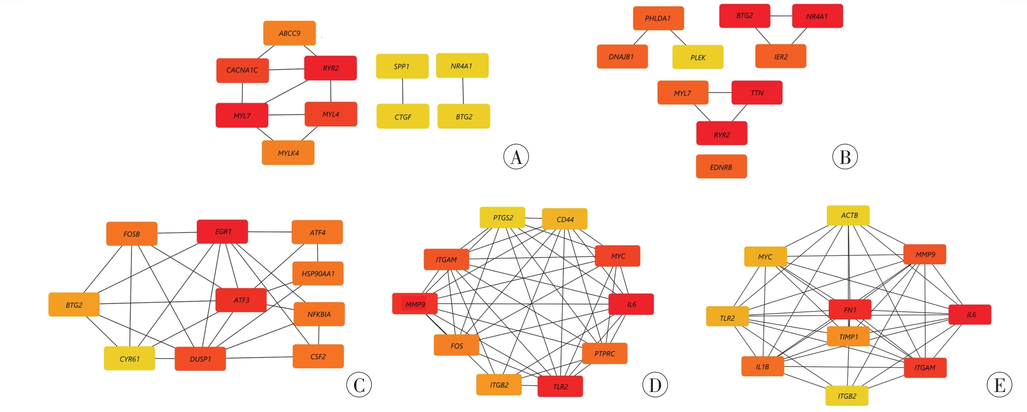 | 图4 关键基因的共表达及互作网络 A:1 h;B:4 h;C:12 h;D:24 h;E:48 h。Degree值越大,颜色越深。 |