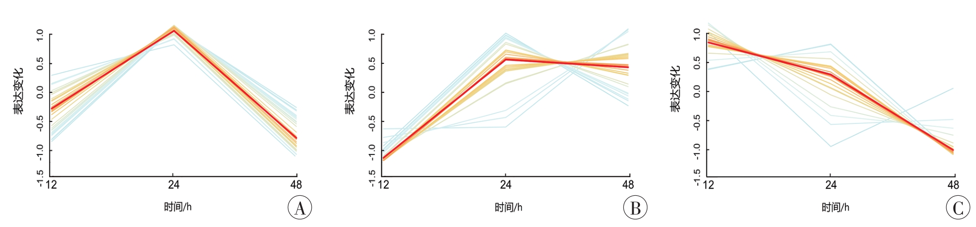 | 图6 AMI后12、24、48 h差异表达基因的时序性表达 A:先上调后下调基因;B:上调基因;C:下调基因。红色为该聚类中心变化,黄-灰-蓝颜色变化表示依次偏离聚类中心。 |
