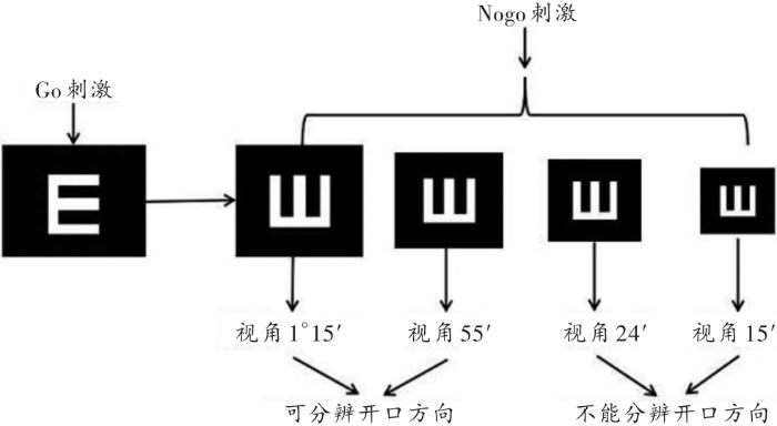 A:Go刺激图形(视角1°15′);B:Nogo刺激图形(视角1°15′、55′、24′、15′)。