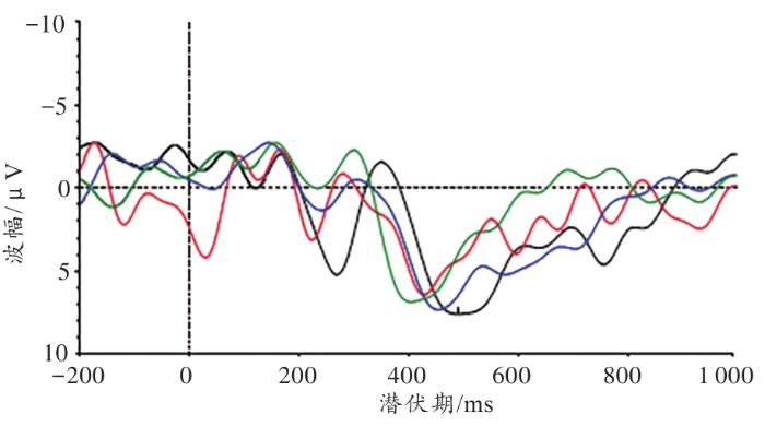 使用BrainVision Recorder 1.20软件(德国Brain Products公司)记录各通道脑电信号,滤波带宽为0.016~100 Hz。数据采集结束后,应用BrainVision Analyzer2系统软件进行脑电数据的离线分析,具体分析过程为:将参考电极由FCz改为TP9和TP10(两侧乳突),FCz添加为记录电极;校正眼电对各通道脑电波形的影响;去除伪迹时选择去除1 ms间电压变化值大于50 μV、100 ms内电压变化值小于0.5 μV、200 ms内波峰-波谷电压变化值大于200 μV的干扰信号;数字滤波设定滤波带宽为0.016~35 Hz;取刺激前200 ms到刺激后1 000 ms的数据分段;参考刺激前200 ms进行基线校正,并去除波幅电压超过±100 μV的干扰信号;叠加平均/总平均后生成ERP波形和300~600 ms脑电地形图。