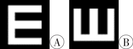 | 图1 视敏度ERP实验的基本刺激图形 A:Go刺激图形(视角1°15′);B:Nogo刺激图形(视角1°15′、55′、24′、15′)。 |
