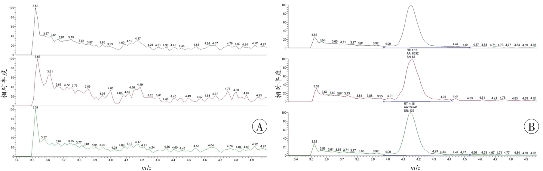 | 图3 血液样本中PEth-16:0/18:1的SRM扫描色谱图 A:空白血样;B:空白血样添加80 ng/mL PEth-16:0/18:1标准品。 |