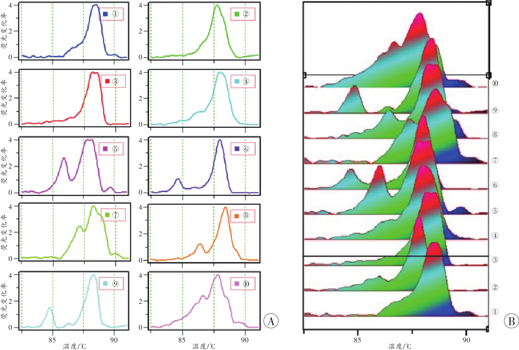 | 图8 10种唾液菌群型的熔解曲线 A:熔解曲线;B:3D熔解曲线。①~⑩指样本中检出的10种菌群型。 |