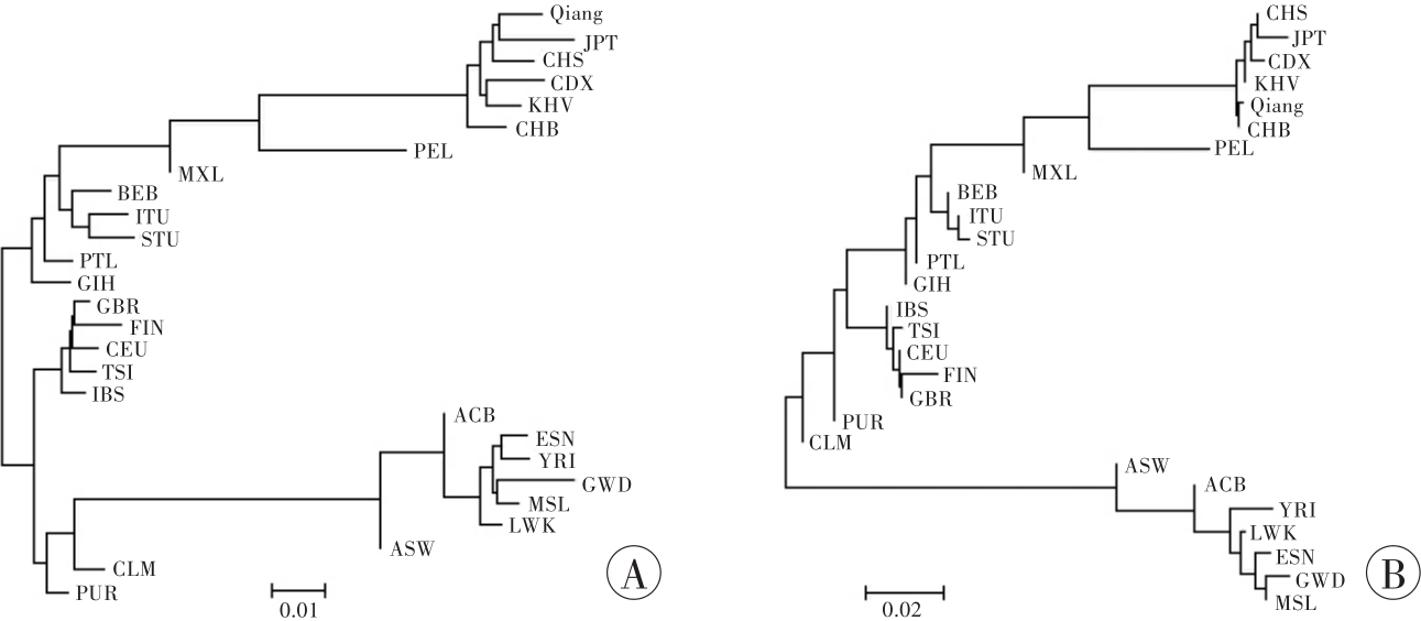 | 图2 27个人群间的系统发育树 A:基于Nei’s遗传距离;B;基于Fst遗传距离。人群的缩写参表1。 |