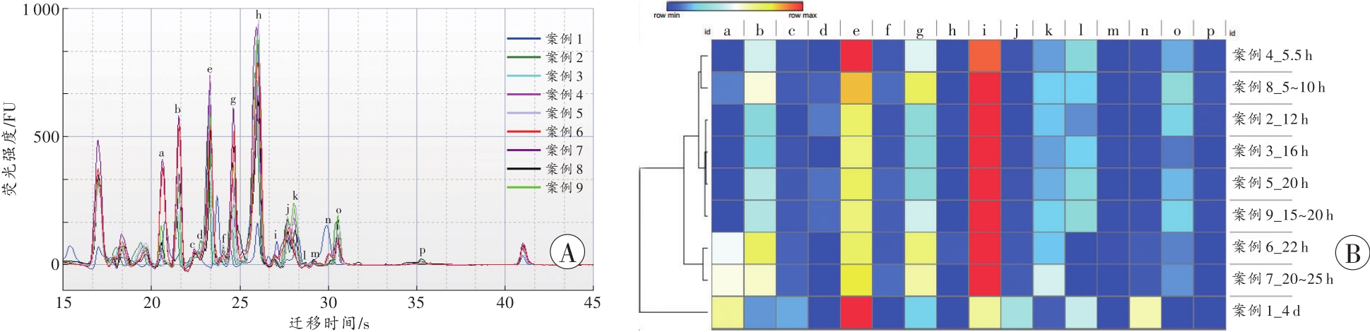 | 图4 死后人体骨骼肌蛋白质的表达 A:谱峰全貌;B:不同死亡时间各峰含量的热图及聚类结果,横向表示识别出的16个峰,纵向表示9个案例的死亡时间,颜色由浅到深表示峰含量由少到多。 |