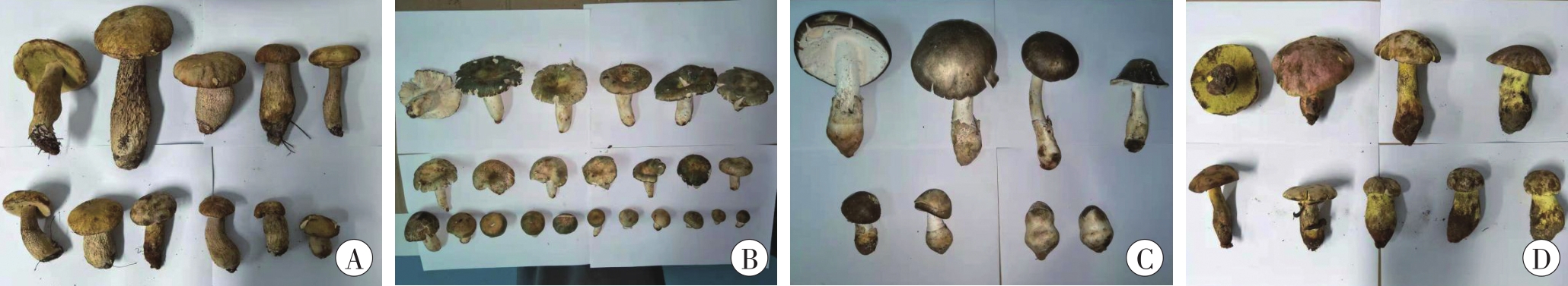 | 图1 本案涉及的4种野生菌 A:美味牛肝菌;B:变绿红菇;C:隐花青鹅膏;D:粉黄黄肉牛肝菌。 |
