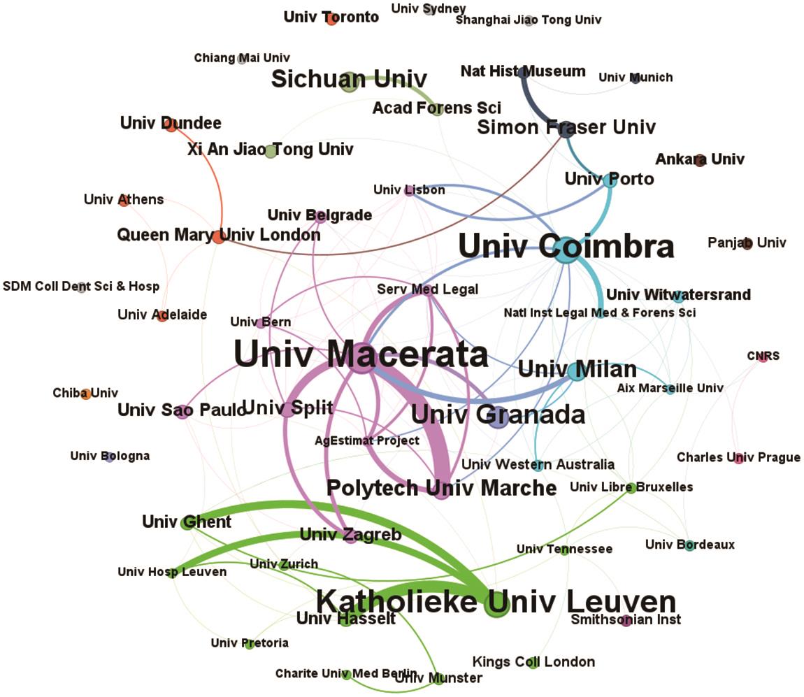 | Fig. 3 Co-occurrence network diagram of literature issuinginstitutions in the field of forensic anthropological remainsidentification research from 1991 to 2022 |