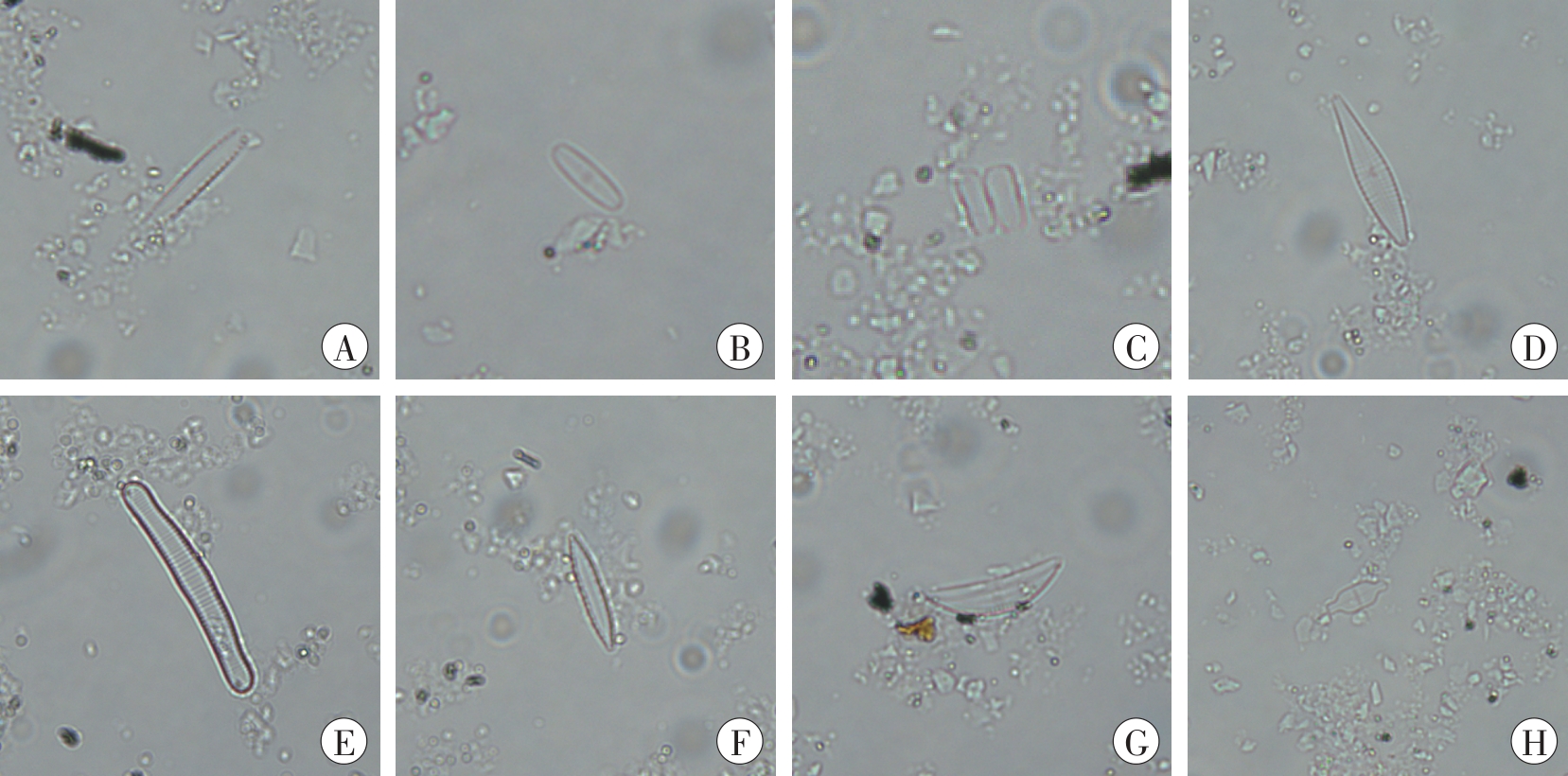 | 图3 PHP消解法处理后光镜下的硅藻 A:菱形藻属Ⅱ;B:曲壳藻属;C:双壁藻属;D:异极藻属;E:短缝藻属;F:菱形藻属Ⅰ;G:桥弯藻属;H:舟形藻属。  |