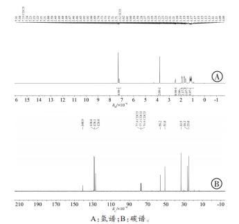 | 图6 化合物A游离碱的核磁共振谱图 A:氢谱;B:碳谱。  |