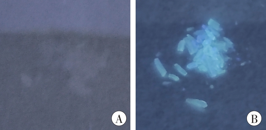 | 图2 晶体A和晶体B在紫外光下的外观性状 A:晶体A;B:晶体B。  |