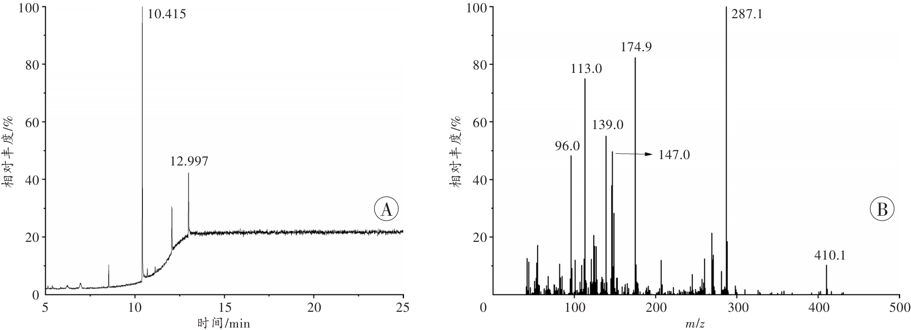 A:总离子流图;B:12.997 min处的质谱图。