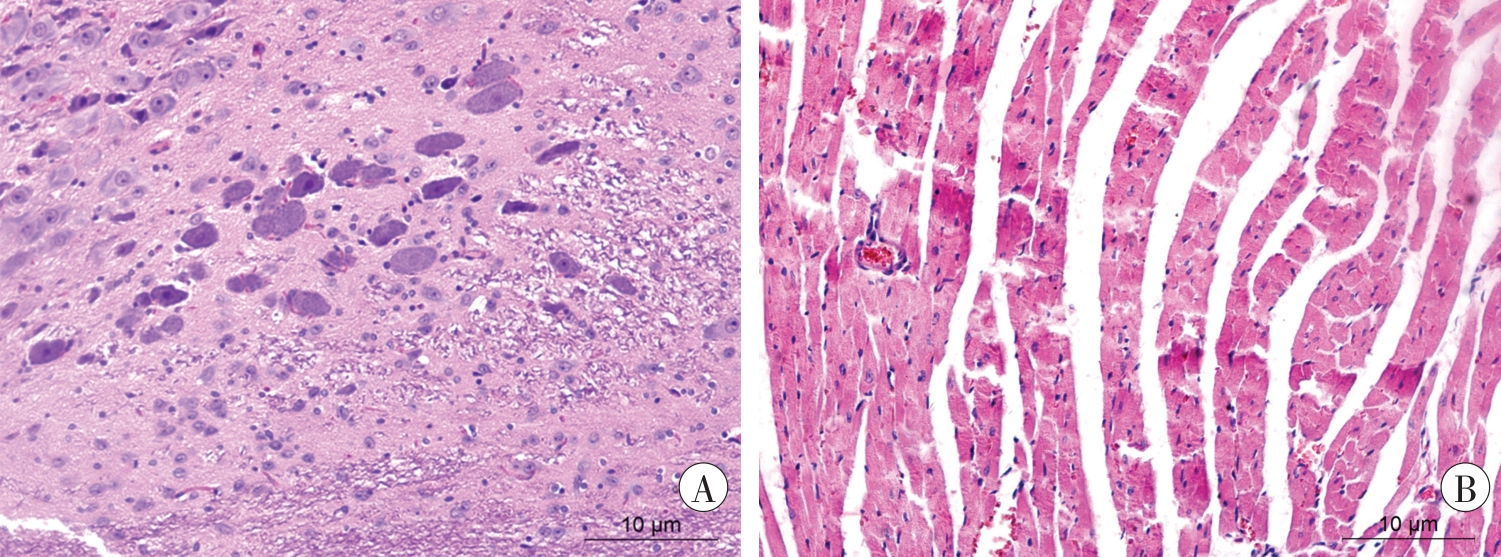 | 图2 急性过劳死组大鼠的组织病理学改变(HE×40) A:脑干;B:左心室心肌。 |