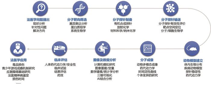 第五阶段,即法医学应用阶段,经过前期的动物实验、临床试验,结合法医学领域预设问题,探索法医分子影像学应用场景。主要针对法医学相关问题的基础研究和应用研究两方面进行,研究方向集中在法医精神病鉴定、毒品损伤、青少年网络游戏成瘾及应激性损伤(包括应激相关障碍)等方面。