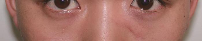 伤后6年病历:左眼流泪、活动受限6年。眼部检查:右眼视力1.0,左眼视力0.6;左侧下眼睑距睑缘3 cm处可见陈旧性瘢痕,泪小点正常,泪道冲洗不通畅,完全反流;左眼球上、下转受限;左眼角膜明,瞳孔圆、散大,直径5 mm,对光反射消失,晶体透明。诊断:左侧动眼神经损伤,左眼泪道阻塞。