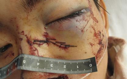 审阅受伤当日损伤情况,面部照片(图2)示:左眼上下睑肿胀、青紫,左眼内眦肿胀,鼻背部左侧有一舌形皮瓣状已缝合创,基底部向上方,缝线在位,与其相延续的左侧眶下区有一斜行线形已缝合创。