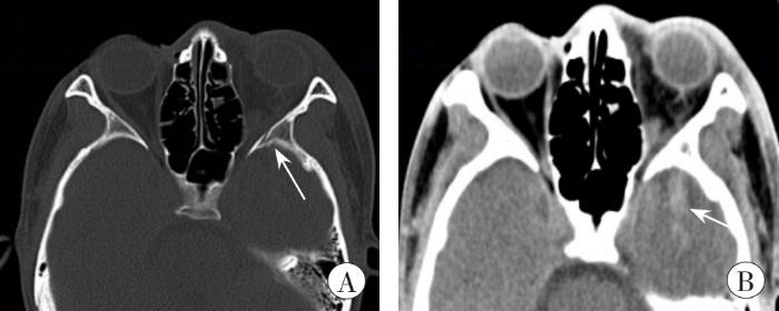A:左眼眶外侧壁近眶尖处骨折(箭头所示);B:左颞叶脑挫裂伤(箭头所示)