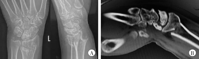 某年11月29日(受伤当日)当地人民医院X线片(图1A)示:左桡骨远端骨质中断,断端移位并成角,骨折远端向桡侧、背侧移位,近端向掌侧移位,尺骨茎突撕脱骨折。左手舟骨及月骨形态均欠规整。周围软组织区肿胀。