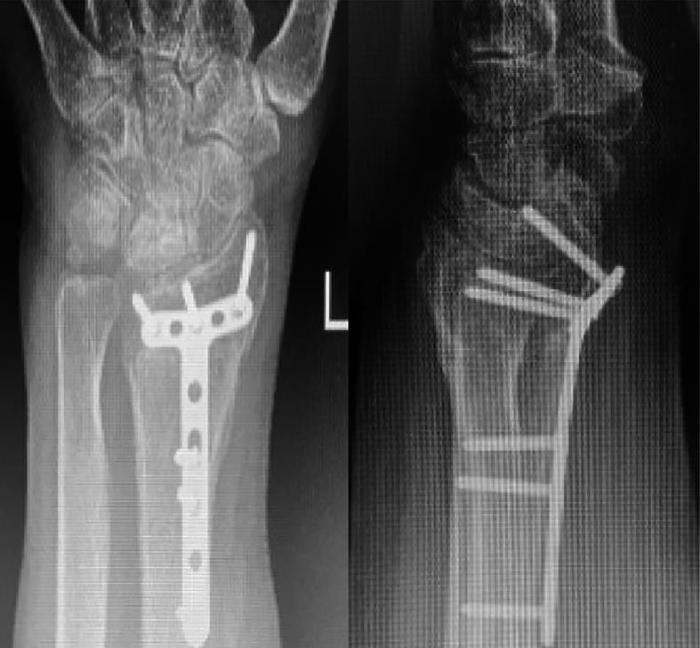 次年3月4日当地人民医院X线片(图2)示:左桡骨远端、尺骨茎突骨折复查,桡骨内固定中,断端对位对线好,尺骨茎突骨折断端对位对线可,局部可见骨痂形成,腕关节间隙变窄,周围软组织略肿胀。